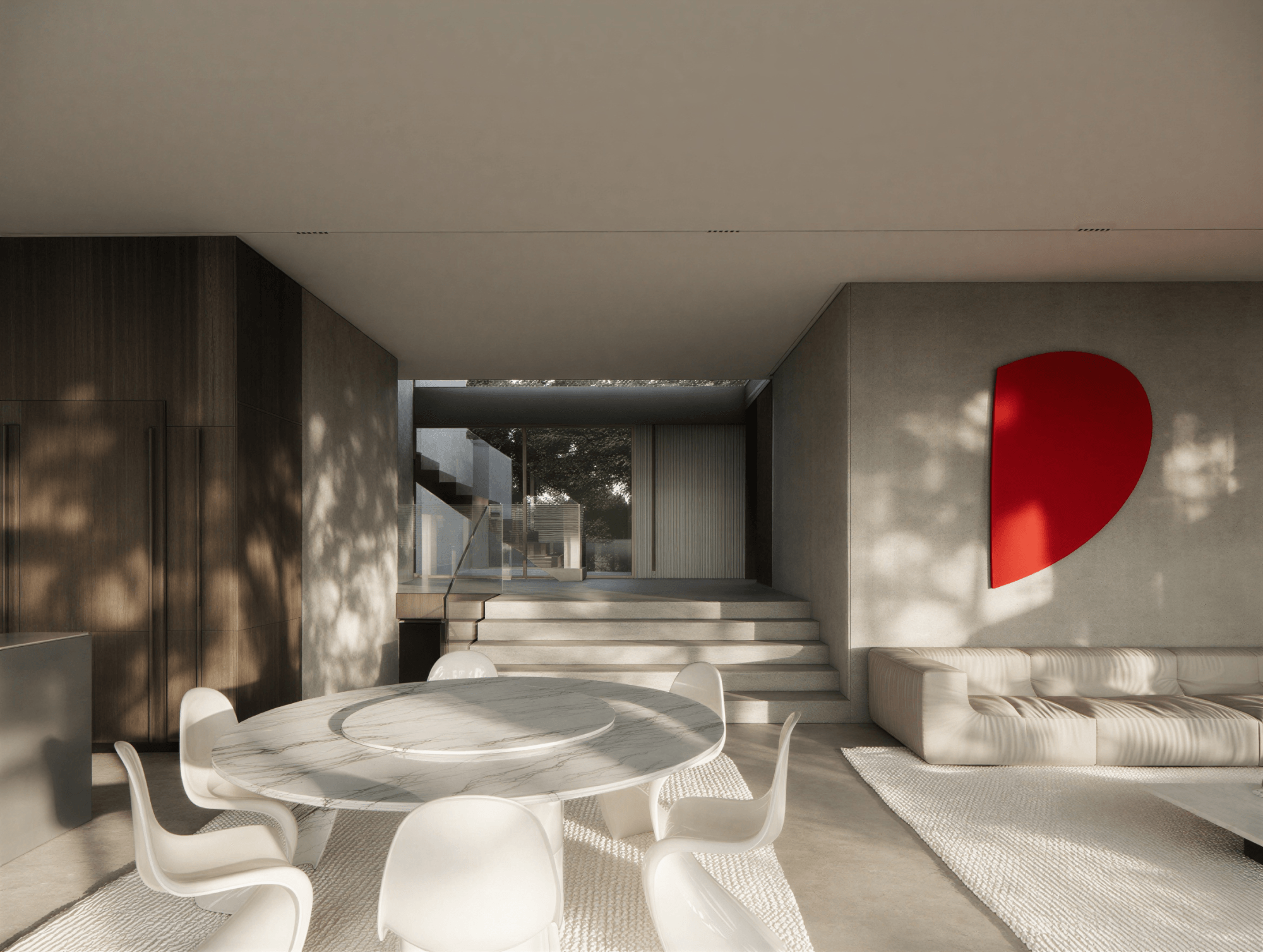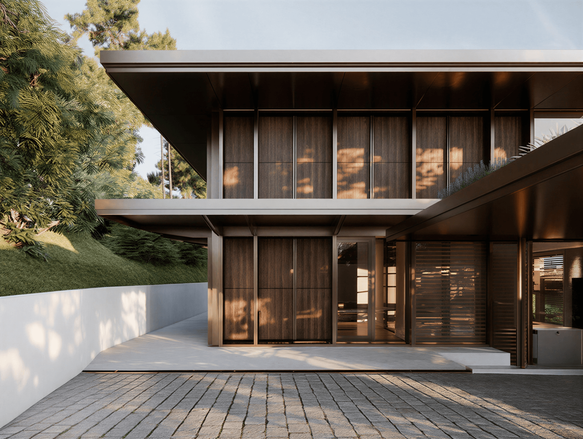 Volontiers contemporaine, la maison s'affirme par sa discrétion constructive et son intégration à l'environnement existant, riche de multiples essences et d'une mini forêt de pins. Construite à la manière d'un Meccano, elle propose une claustra sur l'ensemble du pourtour de la villa en alternant bois (des panneaux de chêne incombustibles Parklex) et métal avec l'implémentation d'une poutre en acier tous les 180 centimètres. Une rigueur quasi monacale dont se dégage dégage un sentiment d'apaisement et de retraite, tant au sens propre – par rapport au voisinage– qu'au figuré.