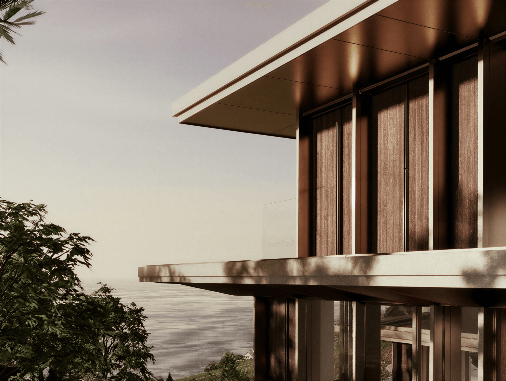 Le contexte tout d'abord, car le terrain se situe dans le Lavaux, en pleine zone labelisée UNESCO. L'espace y est fortement contraint, avec l'autoroute A9 en surplomb et une pente certaine en contrebas. Au milieu, un terrain relativement plat dans sa triangularité avec une exposition nord-est / sud-ouest, le Léman à ses pieds et le découpé des Alpes chablaisiennes en fond panoramique.