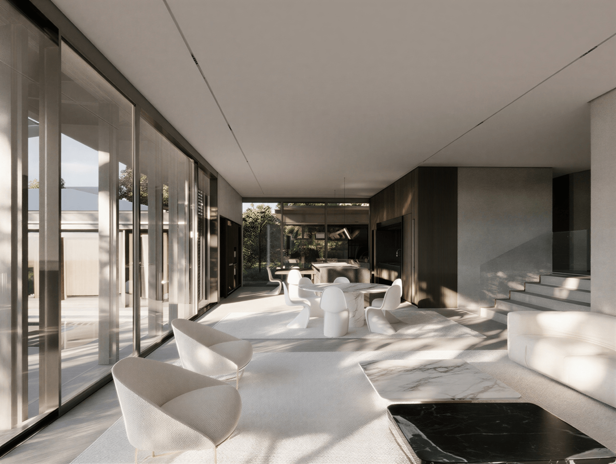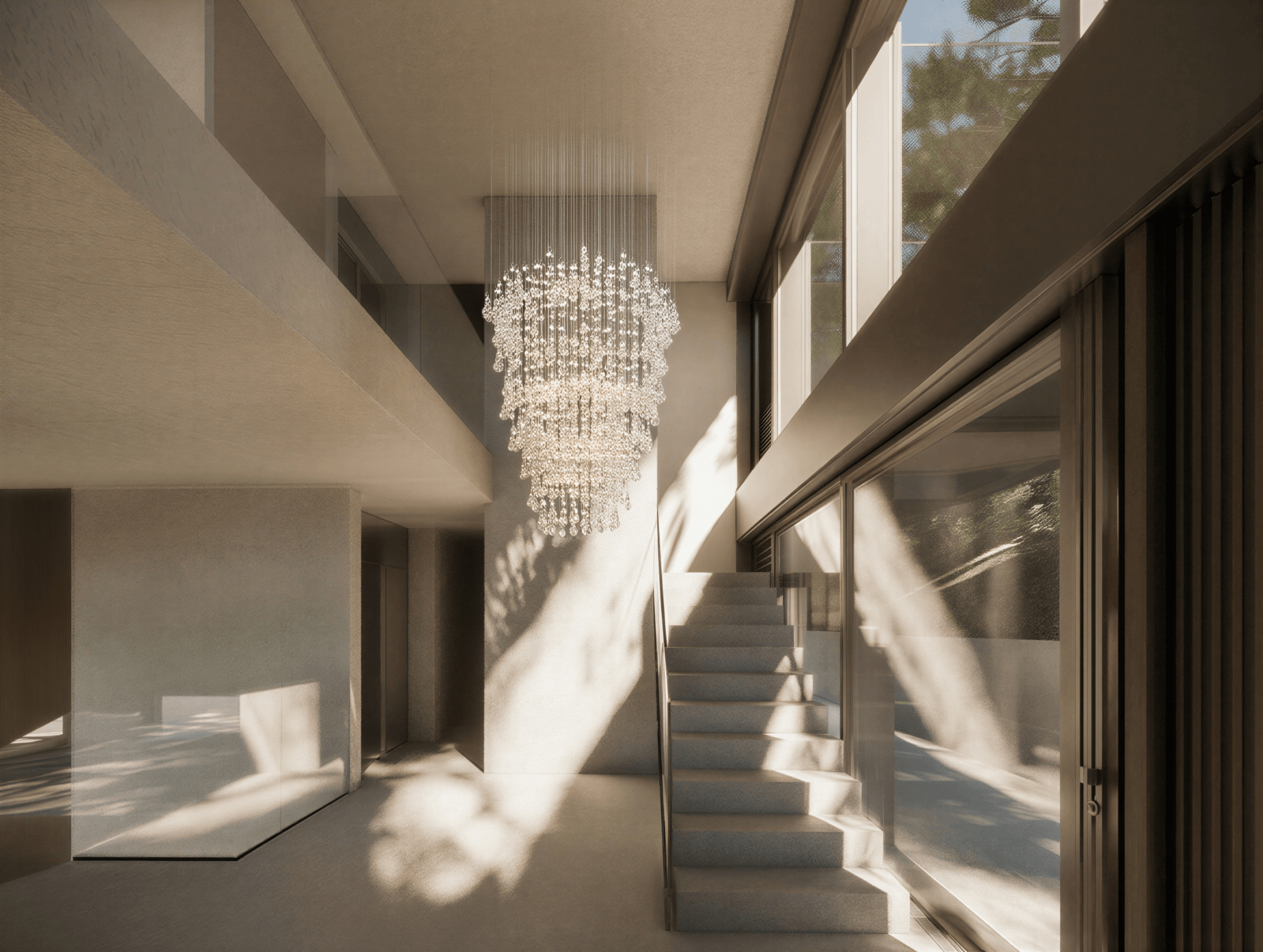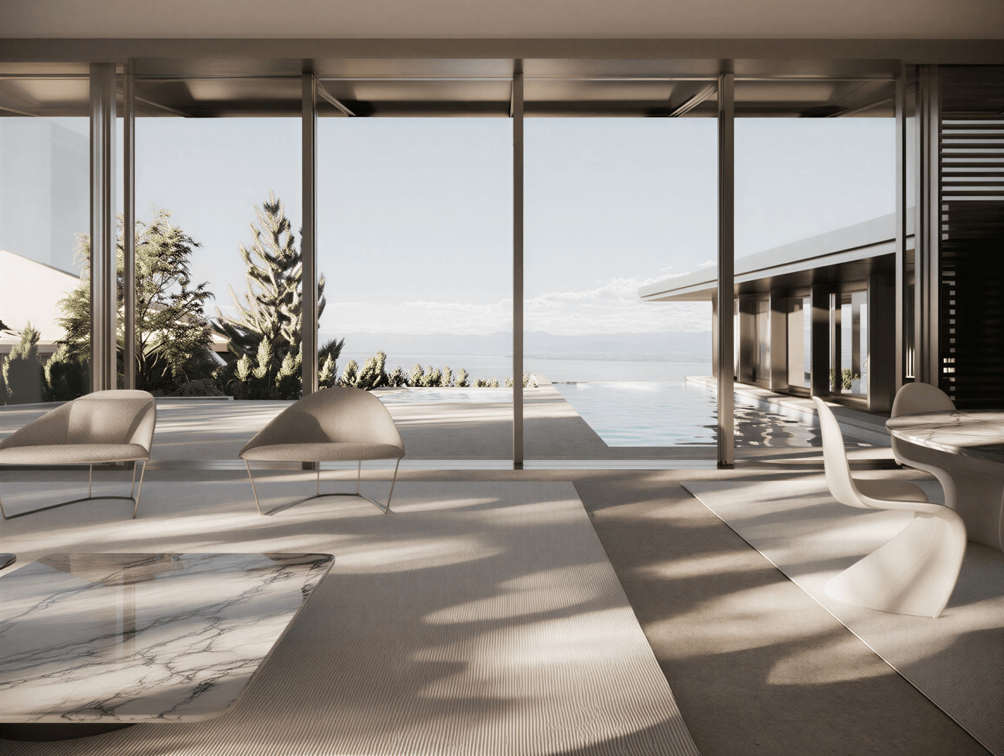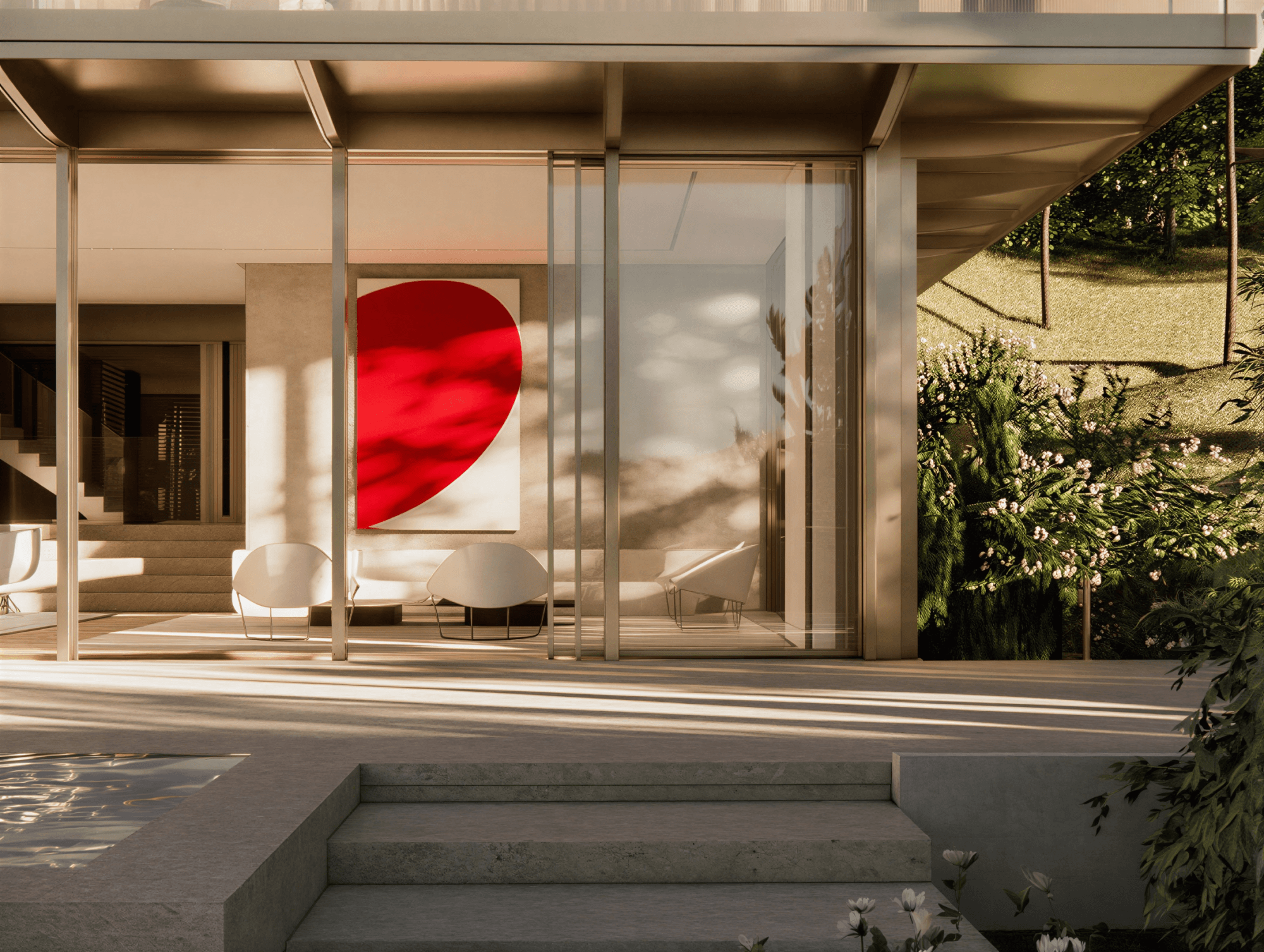 En jouant sur différents niveaux d'intimité, elle s'apparente à une forme de pagode moderne dont les maître-mots seraient l'harmonie et l'intégration à son environnement naturel. D'une couleur champagne tirant sur le bronze, elle brille par sa discrétion, de grands avant-toits venant opportunément protéger les baies vitrées et offrir une quiétude rassérénante à ses habitants, et sa quasi « disapparition » dans le paysage. Les murs de soutènement, qui sont construits en pierre naturelle, adoptent le style des murs de vigne de la région quand la proposition paysagère repose sur quatre grands thèmes essentiels selon nous à l’équilibre végétal de la propriété.